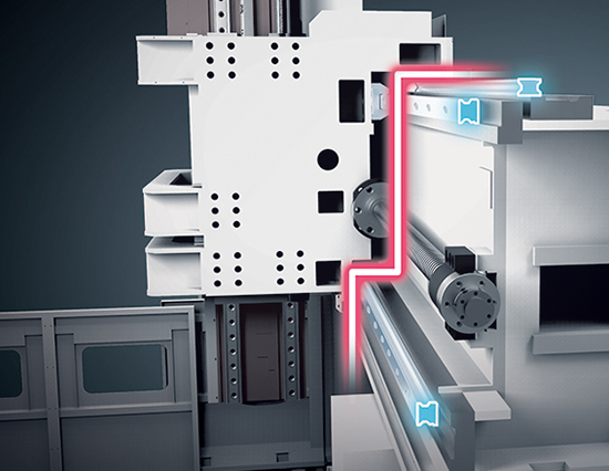 大尺寸橫梁采用段差式三線軌設(shè)計(jì),支撐剛性較傳統(tǒng)平行式軌道優(yōu)異甚多,有效避免頭部自重懸垂,顯著提升本系列重切削能力并維持長(zhǎng)時(shí)間的超高精度