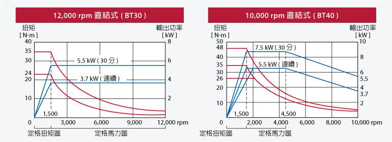 BT40 主軸提供 10,000 / 12,000 / 15,000 rpm 等多種選擇,滿足各種加工需求